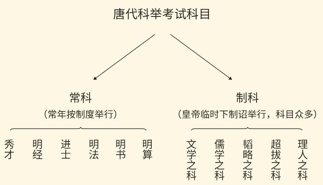 唐代是分科的。第一科叫秀才,考方略策,成绩以文理的优劣分为四等。这是非常难考的科目,而且秀才科的举子如果全部落第,州的长官就要受处分。结果是此科因渐渐无人报名而被废弃,秀才也在明清变成了生员的代名词。